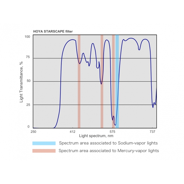 Filtr HOYA STARSCAPE omezuje propustnost světla v oblasti spektra, které je obvykle spojeno se světelným znečištěním ze sodíkových a rtuťových výbojek, které jsou běžné pro většinu měst na celém světě. Filtr díky tomu poskytuje jasnější obraz s přirozenými barvami a vylepšeným kontrastem na noční obloze.
