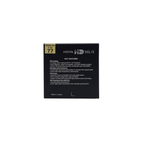 Hoya HD Mk II IRND64 (1,8) je filtr s neutrální hustotou, který snižuje světlo na ekvivalent 6 f-stop. Filtry IRND umožňují fotografům vytvářet efekty jako je rozmazání pohybu nebo efekty plynulosti, ale zároveň jim dávají větší kreativní kontrolu nad expozicí na snímcích. Filtry HD Mk II IRND mají nízkoprofilový rámeček a jsou vyrobeny technologií ACCU-ND s povrchem odpuzujícím vodu a olej.