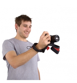- Zápěstní popruh na fotoaparát, který se jednoduše promění v kompaktní, polstrovaný obal.