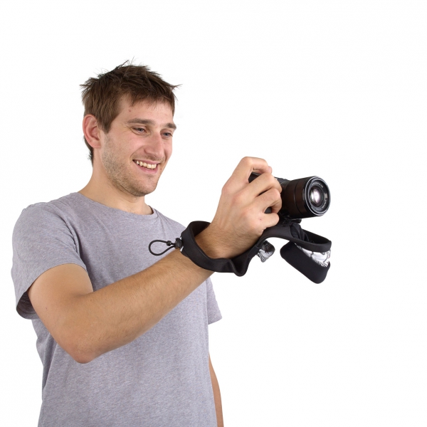 - Zápěstní popruh na fotoaparát, který se jednoduše promění v kompaktní, polstrovaný obal.